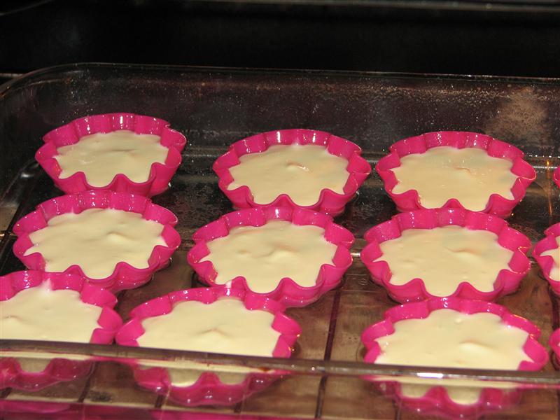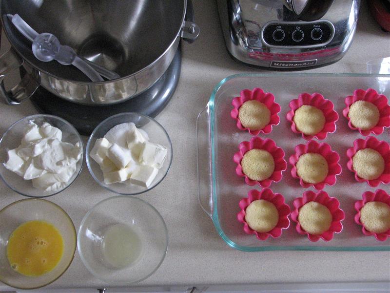 Once you’ve lined the bottoms of your molds, get the cheesecake batter ready: sour cream, cream cheese, lemon juice, and eggs. I halved the recipe, because my silicone cupcake liners are about half the size called for in the recipe. In retrospect, this is probably why they baked up much quicker than the recipe called for.