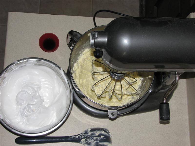 After brushing with a bit of syrup (I reduced the syrup quantity, because I thought it might overdo it a bit to syrup AND frost a pound cake), it was time to make my frosting. I chose the vanilla mousseline from the Miette Tomboy, because it’s been calling my name. It looked SO good from the first moment I opened this book. It didn’t disappoint.