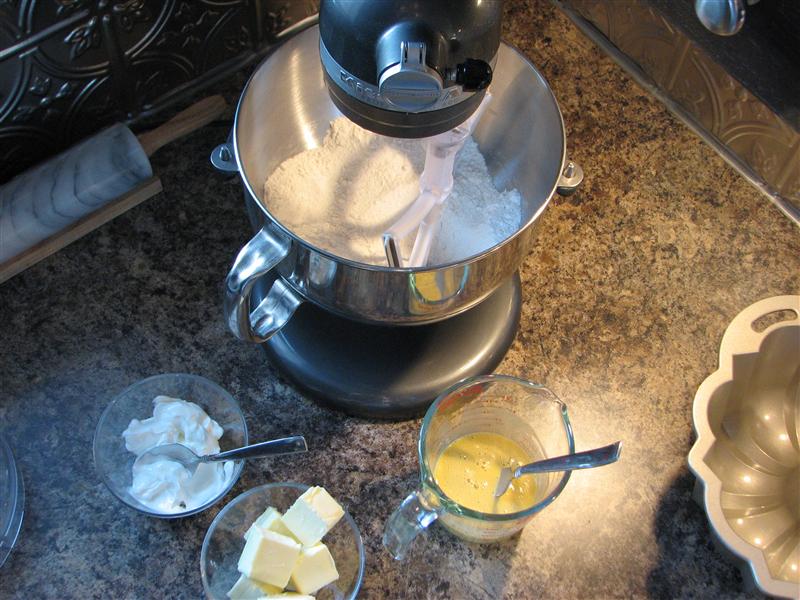 You start by combining your dry ingredients, then add the butter and most of the sour cream. Beat thoroughly, to develop the structure. The rest of the sour cream gets mixed in with the eggs and vanilla, and this gets added in 2 additions, beating for 30 seconds after each.
