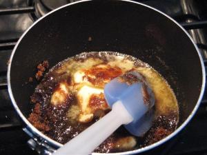 Next, make the toffee sauce. Since I wasn’t planning on serving this right away, I waited until after the cake was out of the oven and I’d taken care of a few other things before starting on the toffee. Rub vanilla pod seed goo into sugar, melt it with butter.