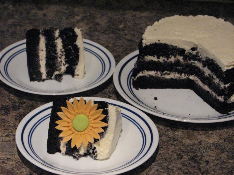 I decided to decorate the cake with a leftover gumpaste daisy I had stashed in my cupboard from my cousin’s wedding cake. Given that they now have about a 6 month old little girl, I don’t think the daisy would be particularly tasty, if it even was to start with, but hey, it’s still pretty. 🙂