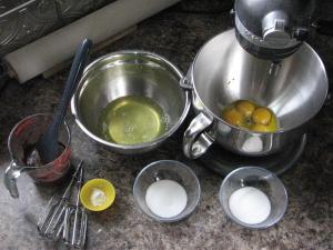 Well, it’s finally here. The last cake of the official heavenly cake bakers project. Despite the weekend* we had around here, I just didn’t feel right missing out on baking this one with the rest of my baking buddies. We picked up some black currant herbal tea at Teaopia. The rest of the ingredients were easy: chocolate, cream and regular pantry items. The cake has a lot of components, but none struck me as particularly challenging (ok, my arm got a bit tired with the Sabayon). I tried to clean up the dishes as I went, but by the end of it, I still had just about a full load in the dishwasher, and several big bowls on the counter. Oh well. Let’s bake!