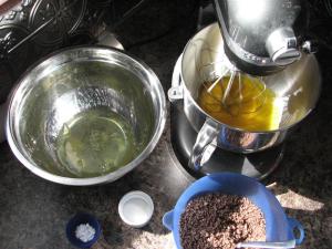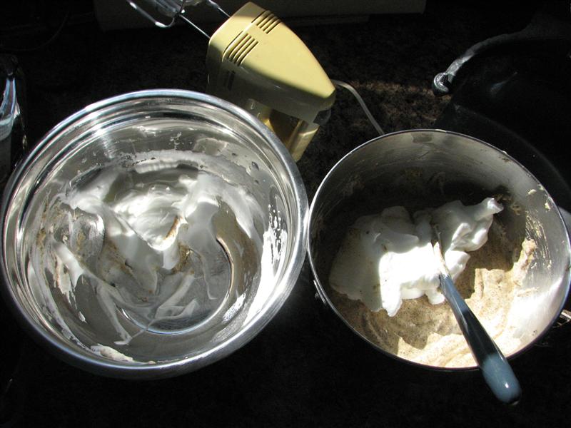 Once the ingredients are ready, the rest is a snap. You whip egg yolks and sugar, make a meringue, fold nuts and chocolate into egg yolks, then fold meringue into the egg yolk mixture.