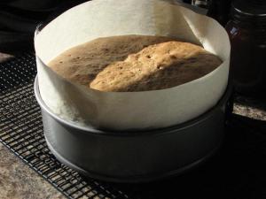 Pour the resulting mixture into a prepared pan. Since my pan was less than 3″ tall, as recommended, I added a parchment paper collar to it.