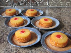 After pouring the caramel in the ramekins, top it with a pineapple slice and a cherry. I couldn’t find any canned cherries that weren’t maraschino, so that’s what I used.