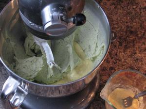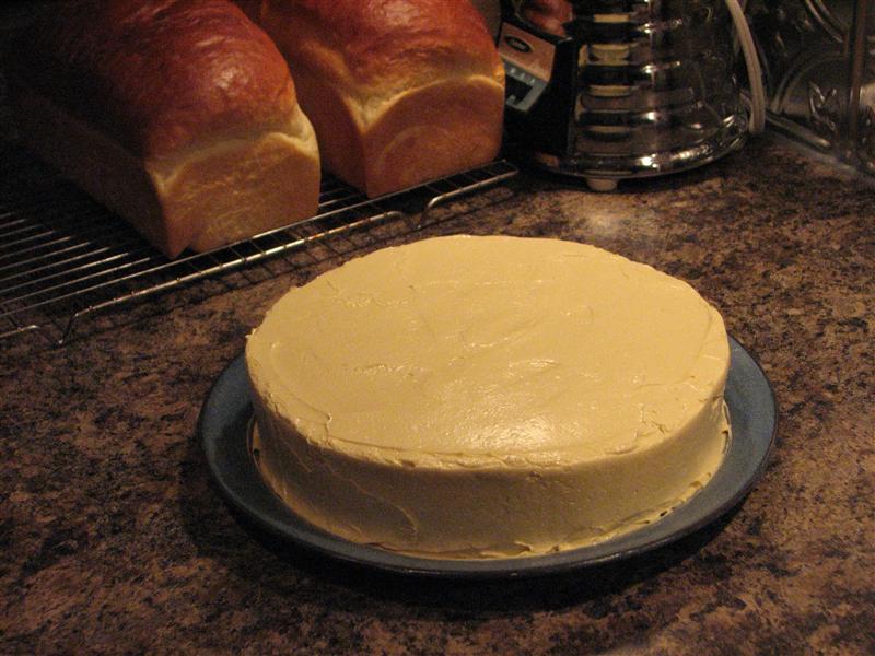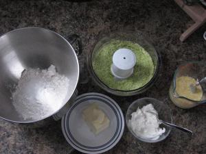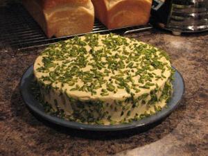 Then make the frosting. This cake uses a golden neoclassic buttercream with a hint of pistachio essence (I think I added too much). I didn’t get pictures of that process (I never do) because there really is no good stopping point to set down the spatula and grab a camera, once you get going, so you just get a picture of the frosted cake, instead.