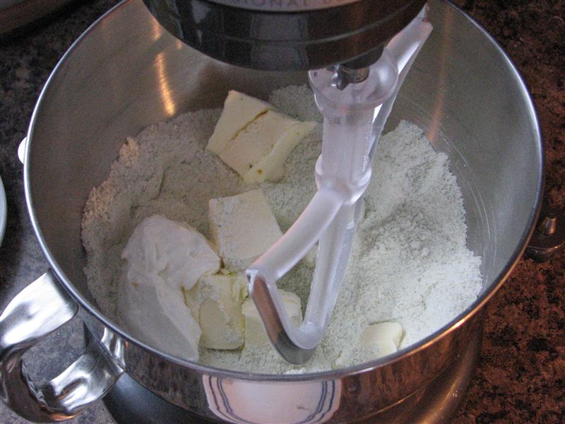 Mix the dry ingredients, along with the ground nuts, then add in the butter and most of the sour cream.