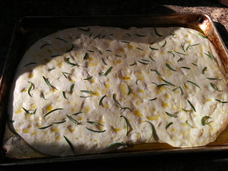 Stretch it out on a well-oiled pan, brush the top with olive oil, and sprinkle with fresh rosemary and salt.