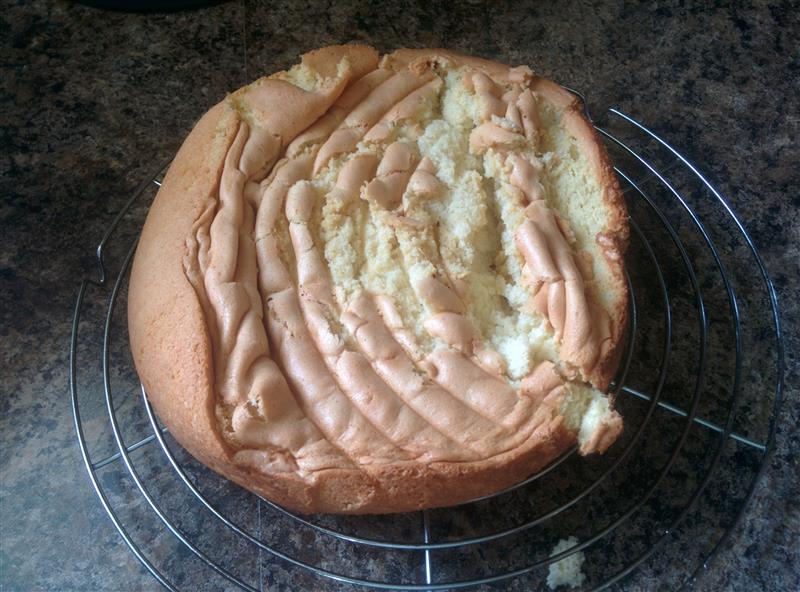 This recipe calls for a springform pan for the sponge cake. I’m honestly not sure why, because I’ve never had an issue unmolding a sponge from a regular cake pan in the past, and this time was disasterous. Once the ring is removed, you’re left with a slippery bottom plate on a wire rack, and when you flip it… well, let’s just say bad words were said. And I burnt my finger trying to catch it. 😦