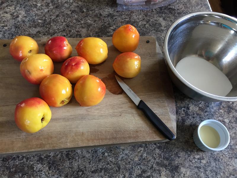 To skin the peaches, place them in a pot of just-boiled water for 1 minute. Then run them under cold water. The skins rub/peel off pretty easily. Then you’ve got a pile of slippery peaches to deal with.