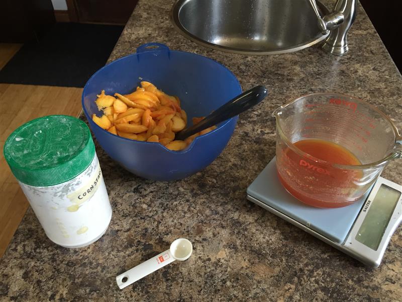 Mix the sliced peaches with sugar & lemon juice, then let that sit for 1/2 hour or up to 1.5 hours. That’s called “macerating” and it causes the fruit to release some of its juices. In the meantime, I kneaded my bread (lurking in the corner in the next picture) and got the pie crust rolled out.