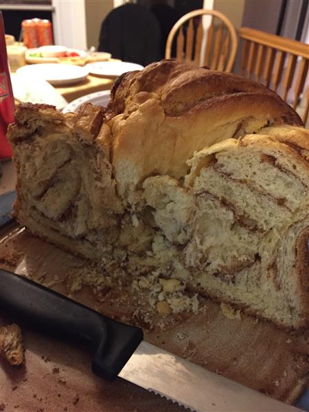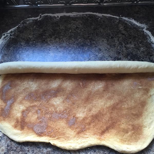 Once the dough’s threatening to pop the seams on the Ziploc bags, it’s time to shape it.  For this, you roll it out into a giant circle… but I’m apparently not good at circles, so mine was a rounded square. Brush with egg, sprinkle with cinnamon and sugar. Roll it up like you would cinnamon rolls.