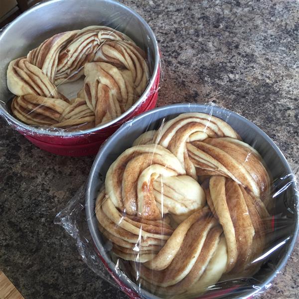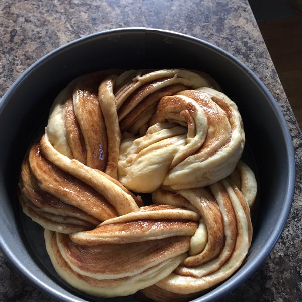 Once it’s sliced, you overlap one over the other, in an X, then start twisting one over the other, keeping the cut side up. Wrap it around itself into a ring, and put it on a (greased) springform pan bottom.