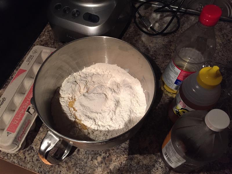 Here’s the first step – mix up most of the liquid ingredients with some flour, then dust that with most of the dry ingredients. Let that sit and ferment for a while.