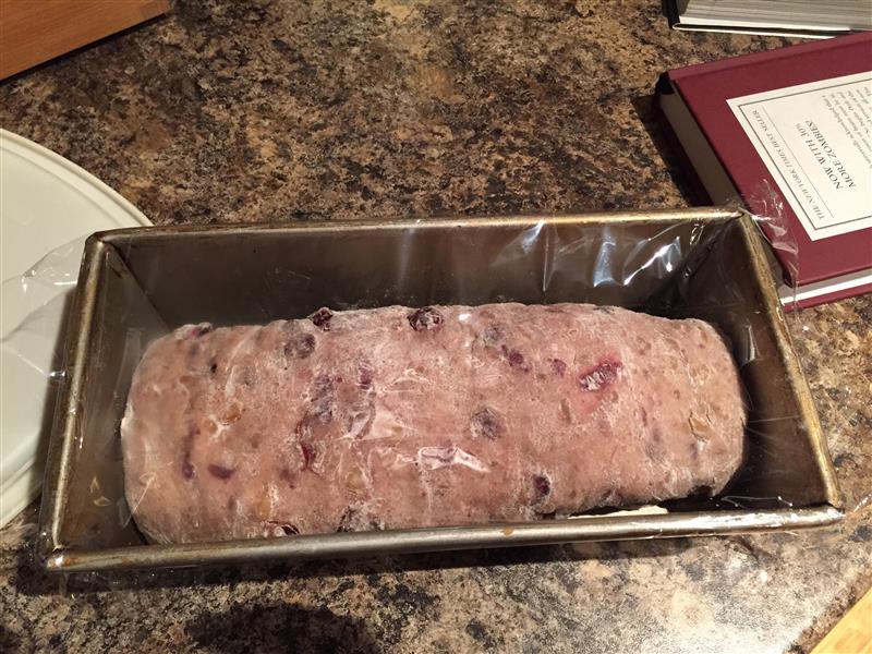 Add the flour to the water & biga mixture, knead it into a rough dough, then let it rest for 20 minutes. This is a perfect time to go deal with laundry. Or wrapping Christmas presents, or any other small job on your to-do list. This is why I like bread. Next knead in the rest of the walnuts, then the cranberries. Let it rise for a couple of hours. A great time to go weave. Take the dough out, flatten it into a rectangle, and fold it in on itself, then let it rise for another hour. A good time to go watch an episode of Gilmore Girls on Netflix. Then take the dough out and shape it. This is “supposed” to be a torpedo shaped loaf, but I really like my bread in nice neat loaf shapes. So, that’s what I did.