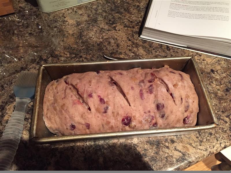 More bread, and more stuff I wouldn’t have picked out on my own, but I’m glad to have baked. I haven’t actually tasted this one yet, but I’m thinking it will probably make a nice breakfast tomorrow. This week’s selection for the Baking Bible bake-through is cranberry walnut Christmas bread. Timely, eh?