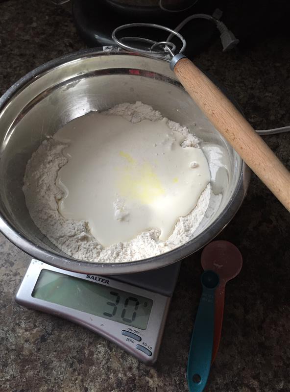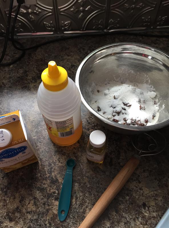 … as opposed to “Irish Cream” scones, unfortunately. The recipe says that the better the cream you use, the better the flavour. The best I could do was cream from Kawartha Dairy, and that was only because we happened to stop at the Victoria Street Market on our way back from the local restaurant supply store, where we needed to pick up vacuum sealing bags. Otherwise, it would have been Sealtest: the stuff made by mixing milk from just about every dairy in Ontario. Maybe someday Eby Manor will start making cream, and I can see if there’s a flavour difference with fancy pants local small-batch cream.