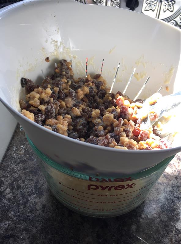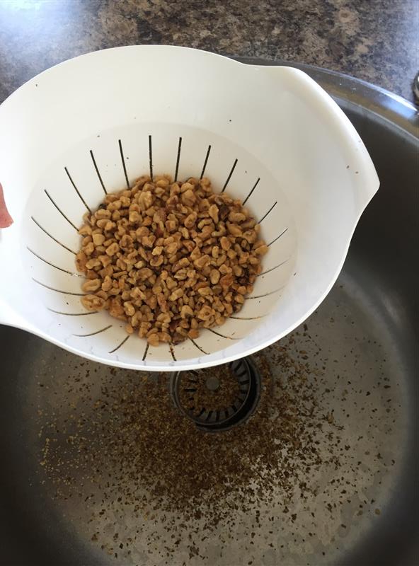 Add the raisins, mix it up, then completely misread the recipe and mix the filling with the raisins. Or, you could actually follow it and only add enough of the filling to coat the raisins and walnuts, and skip this next step to strain the nuts and raisins out again.