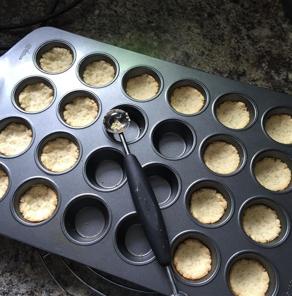 After the dough chilled for a bit, I pressed it into the bottom of my mini muffin pan, squishing it up the sides to make “shells.” Since the bottom puffed up a bit in the oven, I pressed it back round a bit with the back of a melon baller so that it would have a little bit more of a cavity.