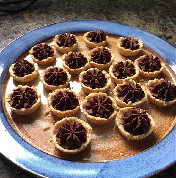 Finally, I made the chocolate ganache mini tartlets today. I halved the recipe, partly because I only have one mini tart pan, and partly because 46 of these things seemed like a ridiculous number, and partly because I wanted to just use up the leftover chocolate ganache from the ChocolaTea cake.