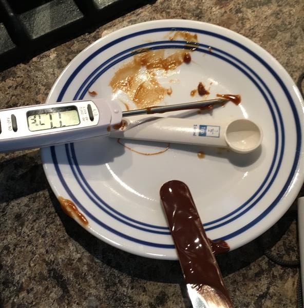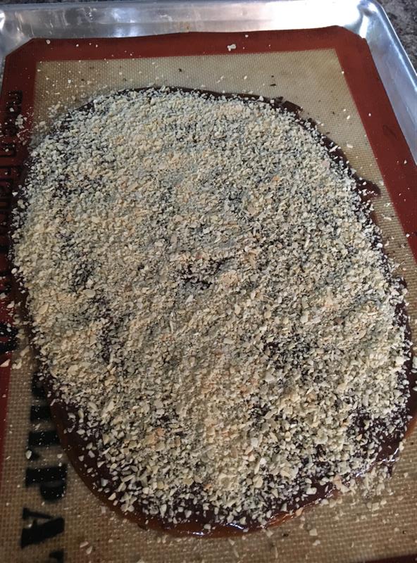 At this point, it goes into the fridge to cool until the chocolate hardens, then it gets flipped and melted chocolate spread on the underside too. Which may be gilding the lily a bit, but it seems like it was worth it. Then cool again, then break it up into consumable pieces.